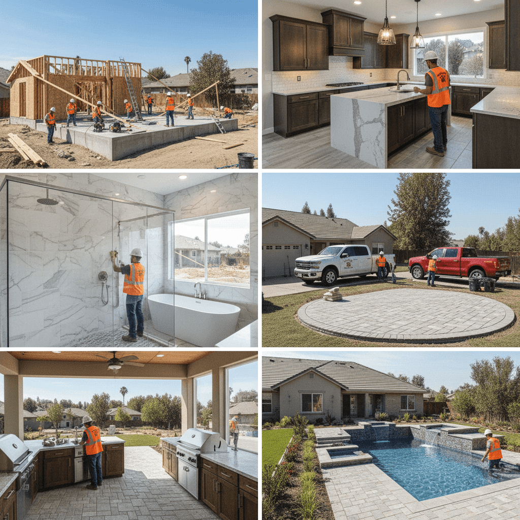 Kitchen & Bathroom Remodeling: Complete redesigns featuring custom cabinetry, premium countertops (including quartzite), elegant vanities, expert plumbing work, and high-end finishes.